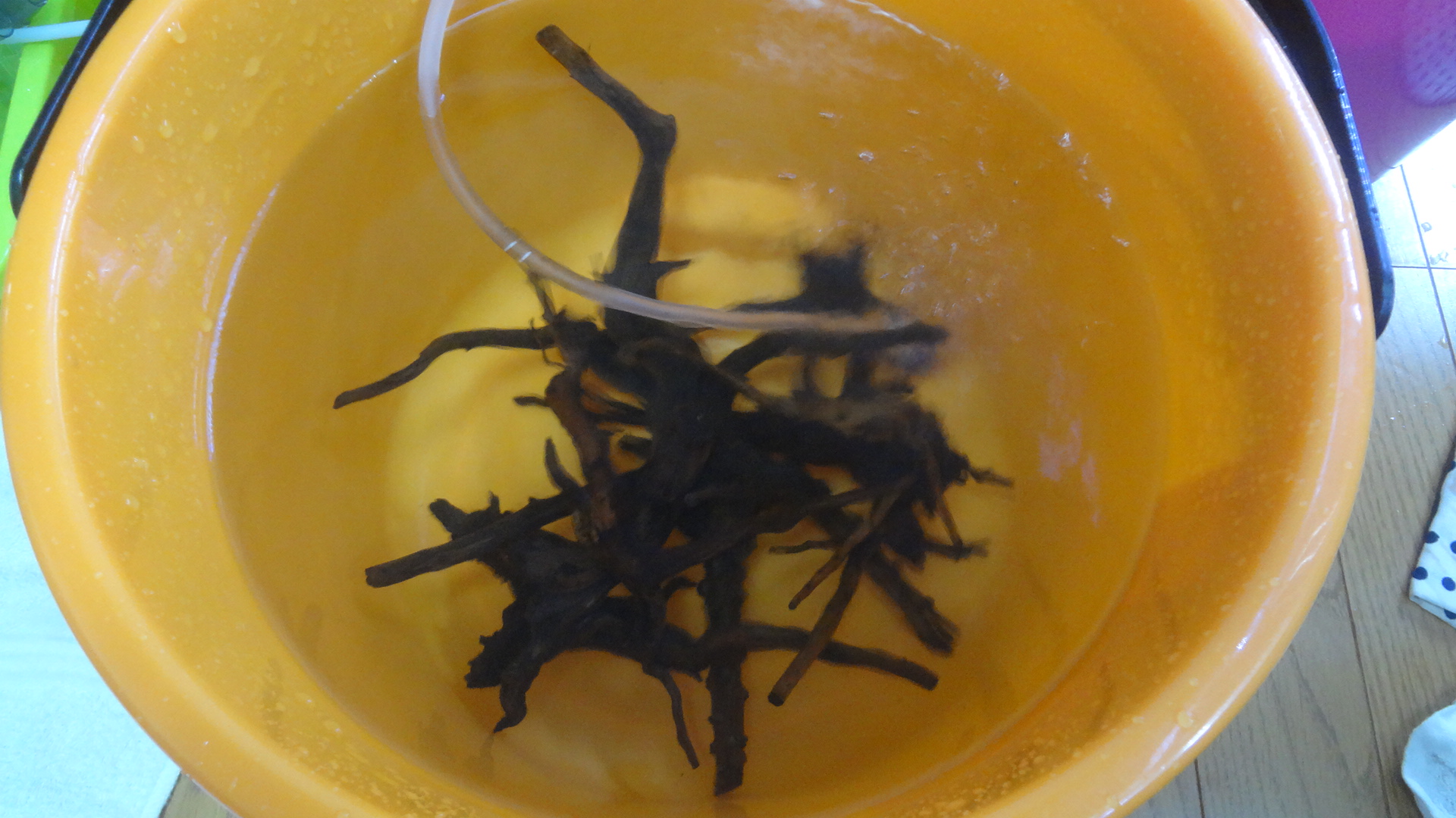 ベランダのバケツに流木を沈めて1か月だった。