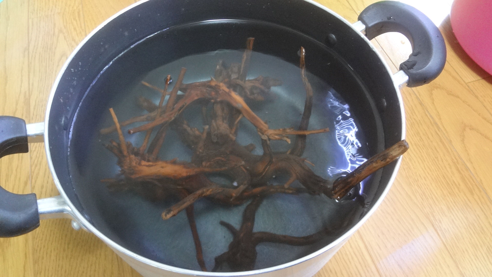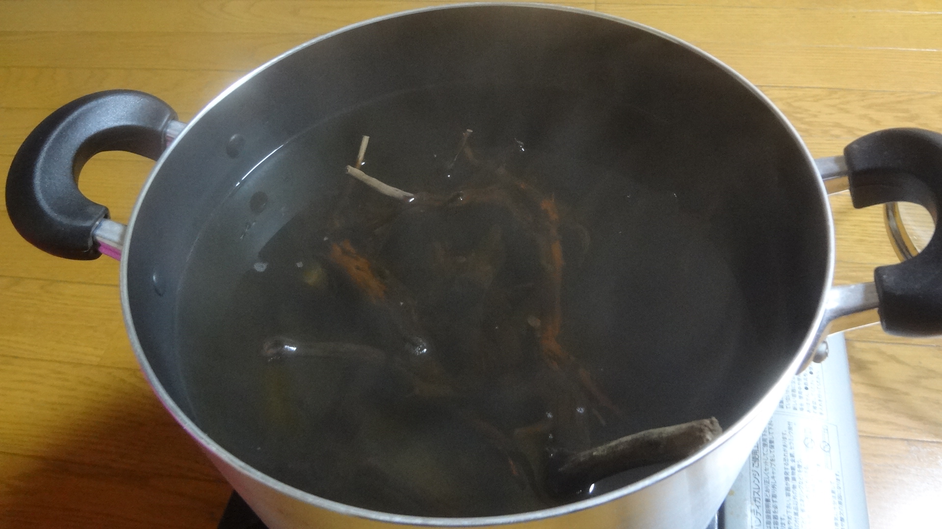 流木を煮立てた後すぐ取り出す。