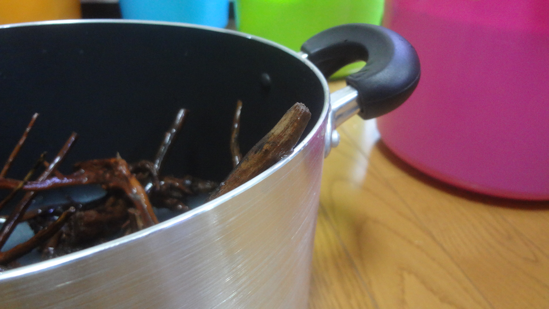 灰汁抜きの為に、煮ました流木を、