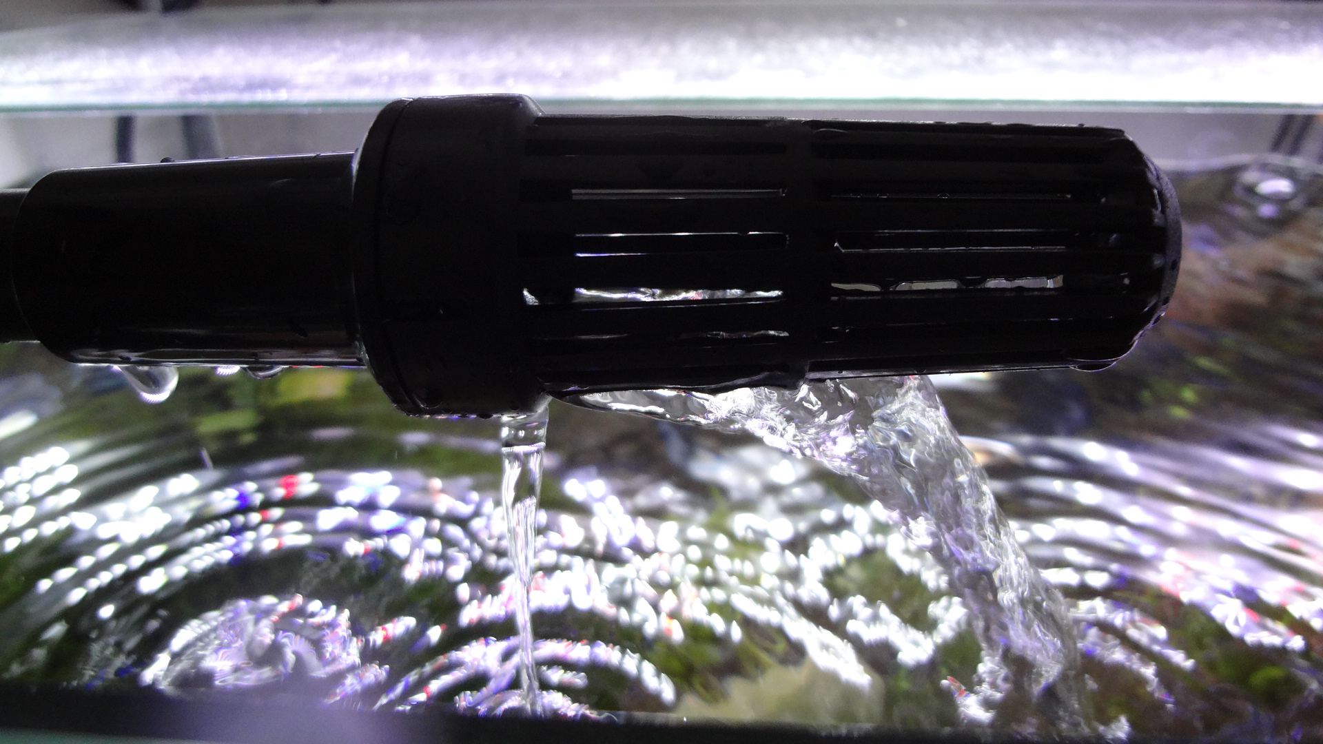 水が、ストレーナー本体に当たり、分散して、水槽に出て行くので、