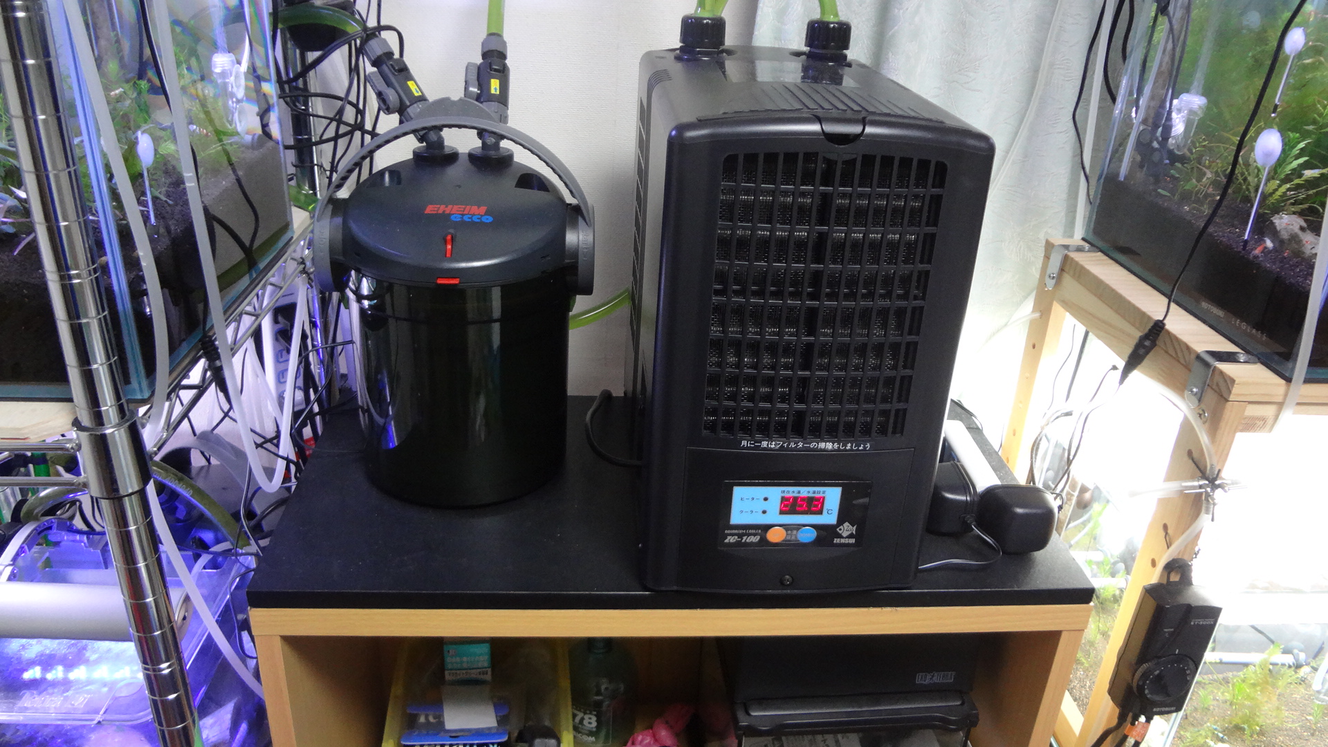 この水槽にも、水槽用のクーラーを、取り付けています。